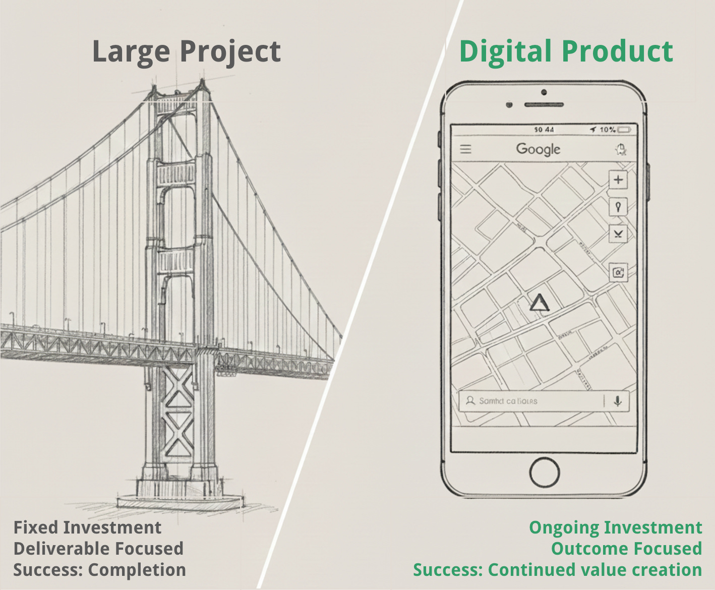 This is a costly error. The traditional, annualized, project-based funding process works well for finite projects where success is measured by completion and designed for fixed lasting value (e.g. a bridge). This approach is not a good match for building successful digital products (e.g., Google Maps), where value compounds over time, with continuous feature releases, and new integrations.